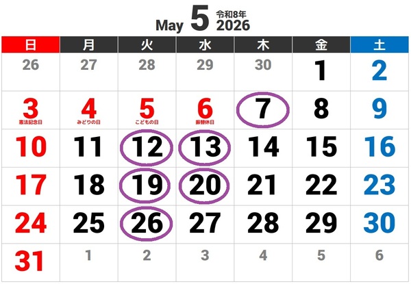 ※4月/5月の定休日は変更になる場合がございます